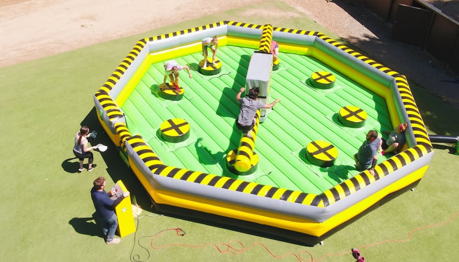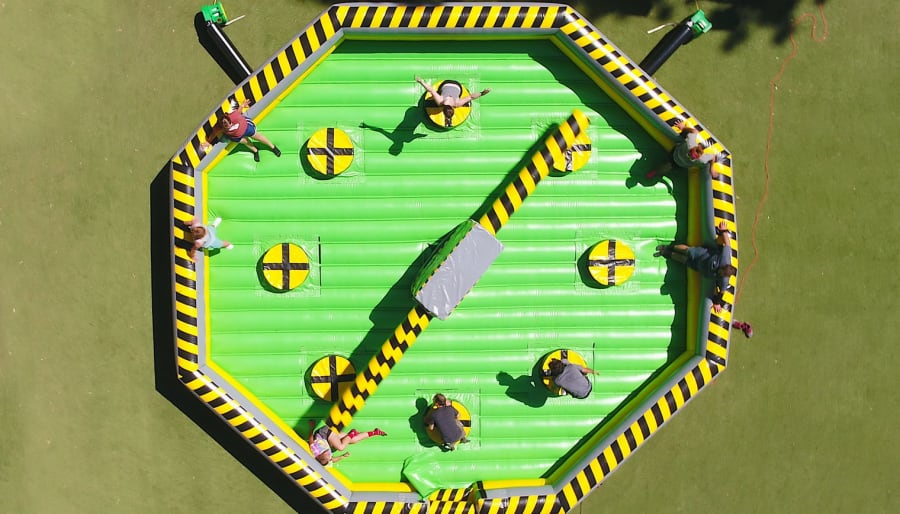 Inspired by the hit television show Wipeout, the Toxic Meltdown features a thrilling multi-player setup where participants must jump, duck, and dodge spinning beams while avoiding the swinging arms that aim to knock them off their podiums. With its vibrant colors and dynamic design, this inflatable game will be the highlight of any event, captivating guests of all ages.