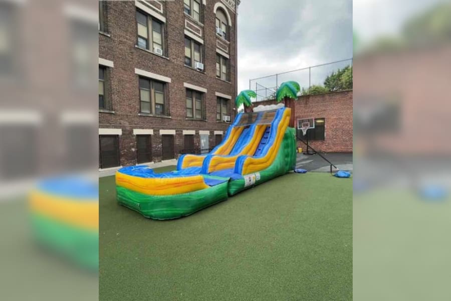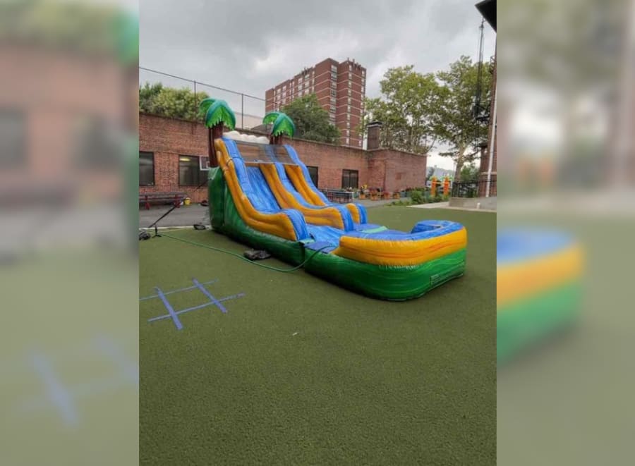 The 15' Tropical Wave Slide features safety netting at the top of the slide, blow up water slide to rent.